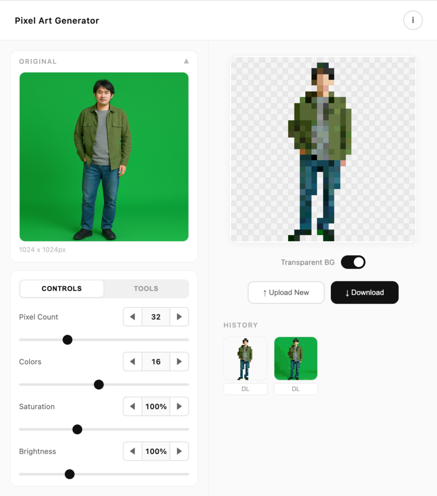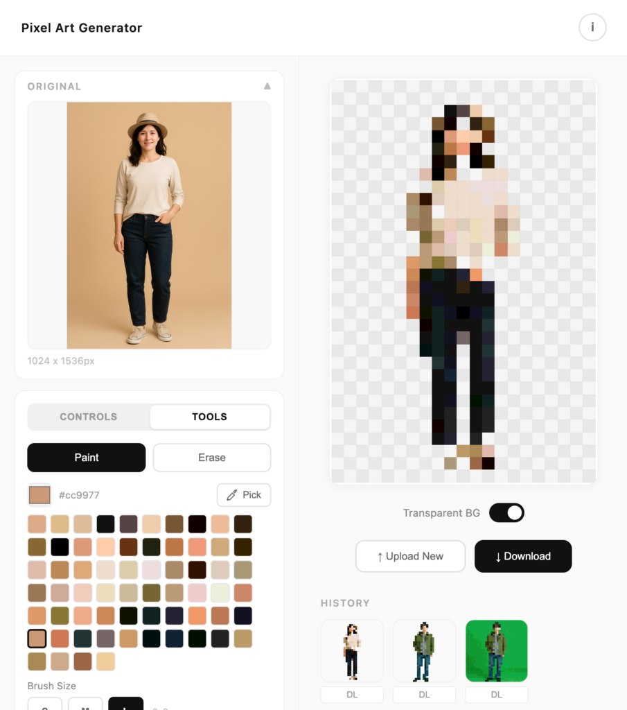 Users upload an image and convert it to pixel art with real-time control over pixel resolution, color count, saturation, and brightness. After conversion, the artwork can be directly edited using paint and eraser tools with an eyedropper for color picking. Background transparency can be toggled on or off, and the final output is exported as PNG — all within one unified interface. An edit history feature allows users to compare multiple variations side by side. The tool is fully responsive across desktop and mobile.